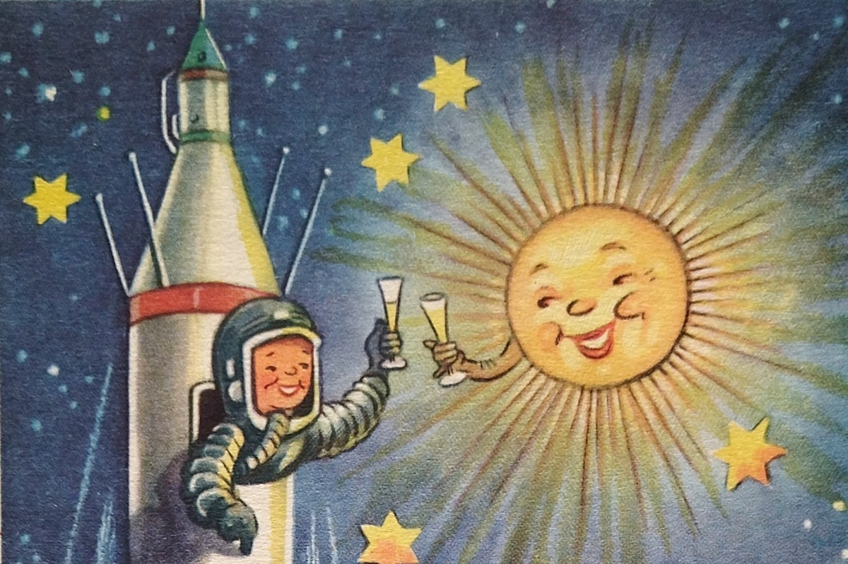 На третьей открытке наш космонавт вплотную подлетел к Солнцу! Небесное светило, естественно, обрадовалось - не часто же такое выпадает. Согласитесь, такую встречу грех было не "отметить".