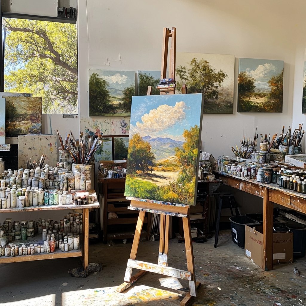 Создано на основе запроса: A photo taken by a iPhone 12 of a real life sunny day in an LA art studio of oil paintings and the main focus is an oil painting that is half finish of a landscape --- Автоперевод: Фотография, сделанная iPhone 12 реального солнечного дня в художественной студии маслом в Лос -Анджелесе, и основной фокус - картина маслом, которая является наполовину отделкой ландшафта Хорошо получилось? 🤔 https://dzen.ru/id/65c0c65c86e4f837c27b24d7 #ИИ #AI #нейросеть #midjourney #art