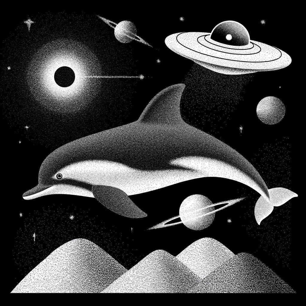 Создано на основе запроса: black and white line art, 1940's, one dolphin, landing his spaceship on nibiru, having a fantastic time