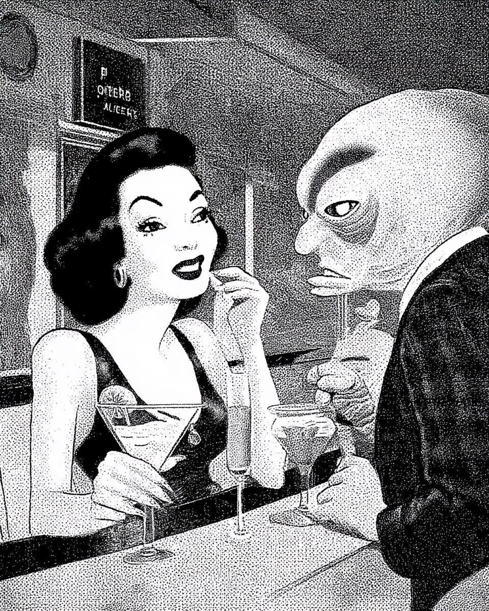 Создано на основе запроса: halftone cartoon print of a a pretty girl on a date with a frumpy grumpy fat old alien from nibiru, they are having cocktails at bar area 51, they are having a blast! --- Автоперевод: HalftOne Cartoon Print of The Pretty Girl на свидании с подвижным сварливым толстым старым инопланетянином из Нибиру, у них есть коктейли в баре 51, у них есть взрыв! Хорошо выглядит? 🤔 https://dzen.ru/id/65c0c65c86e4f837c27b24d7 #ИИ #AI #нейросеть #midjourney #art