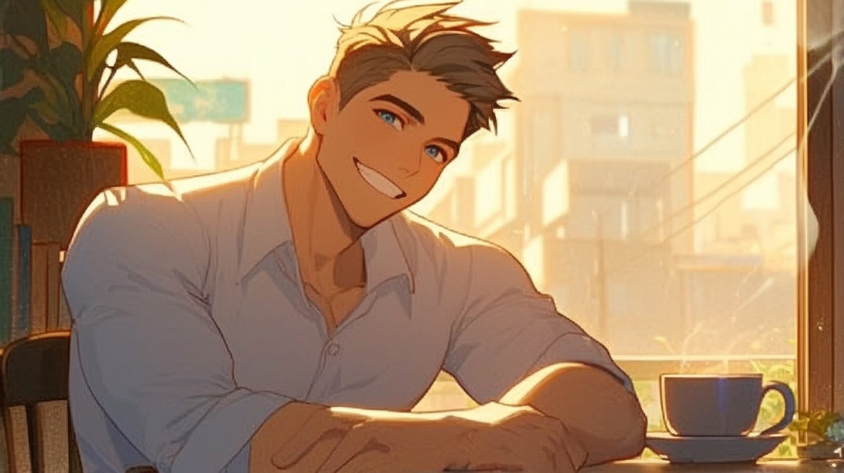 Создано на основе запроса: A man at a café, pleased with his friend's success. His face is full of happiness and excitement, bright eyes, a wide grin. He is leaning across a small round wooden table. The café has a cozy atmosphere with soft lighting, potted plants, warm wood tones, and large windows that let in the golden afternoon light.
