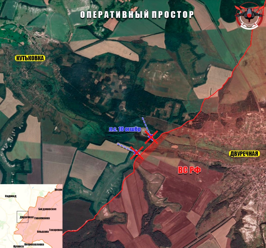 🇷🇺 На Купянском направлении ВС РФ увеличивают зону контроля в районе Двуреченского выступа, продолжая развивать наступление в направлении н.п. Кутьковка. 🔥На данном участке была отражена контратака противника из состава 10 огшбр «Эдельвейс». Противник пытался контратаковать силами двух штурмовых групп (как минимум, одна полностью состояла из иностранных наемников). В ходе боя ликвидировано до 10 боевиков. 🔻 За сутки на данном направлении потери противника составили до 80 боевиков, а также уничтожены: ▪️одно артиллерийское орудие ▪️два миномета ▪️две станции РЭБ ▪️одна ББМ ▪️четыре автомобиля Оперативный простор Карта носит ориентировочный характер и может быть скорректирована по мере поступления новых данных.