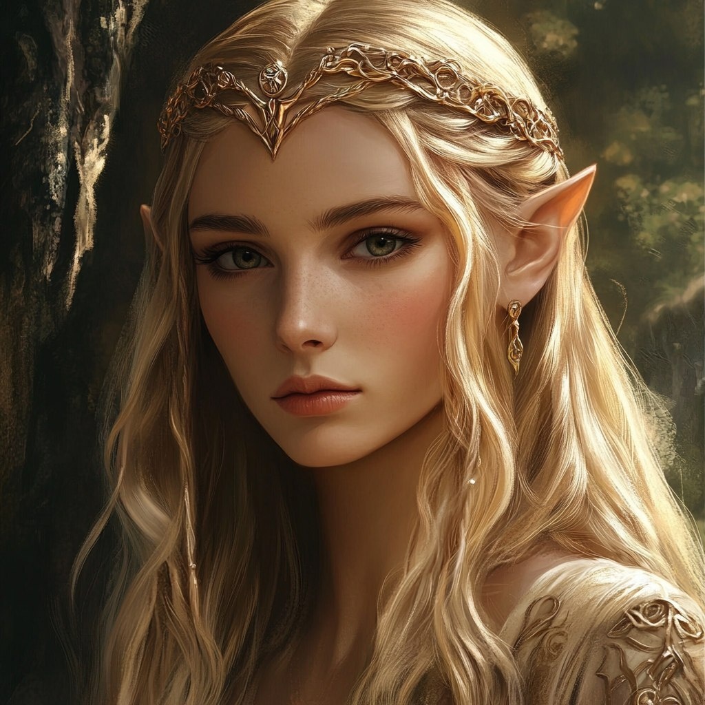 Создано на основе запроса: a female elven queen, slim with light eyes and caramel skin, blonde hair like Galadriel in LOTR