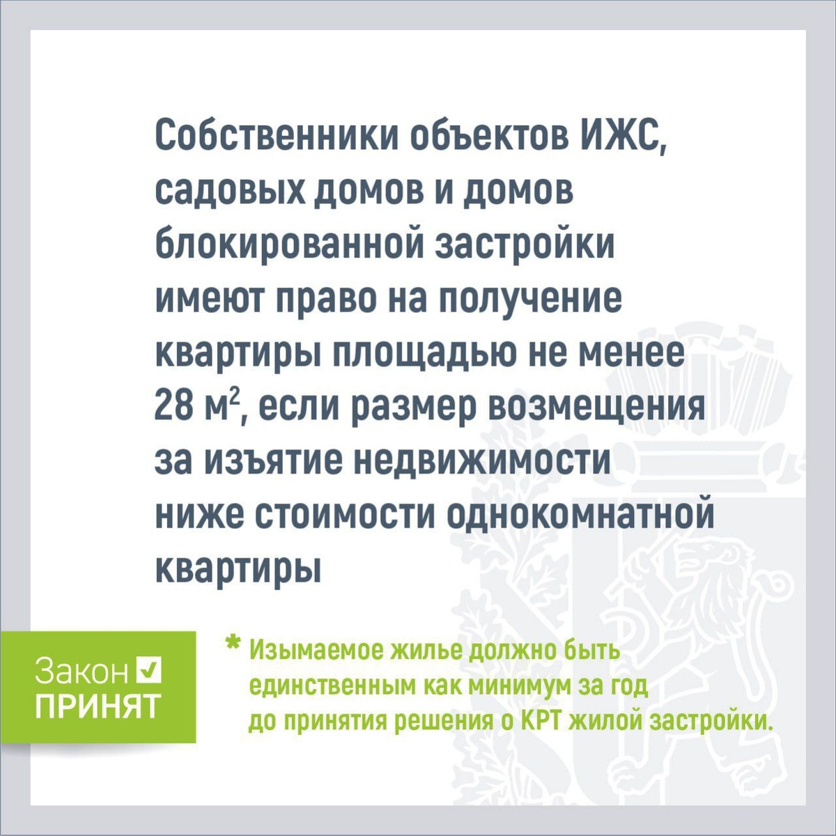 ▶️ Однушку за любую избушку: в Красноярском крае вступает в силу закон о КРТ В Красноярском крае с 12 апреля в силу вступят изменения в законе о комплексном развитии территории (КРТ). Главные изменения, которые утвердили депутаты Законодательного Собрания Красноярского края: 🏠собственники подлежащего сносу жилья в многоквартирном доме имеют право на получение равнозначного помещения в том же поселении или городском округе; 🏠количество комнат и жилая площадь новой квартиры должны быть не меньше площади освобождаемого помещения; 🏠собственники объектов ИЖС, садовых домов и домов блокированной застройки имеют право на получение квартиры площадью не менее 28 кв. м., если размер возмещения за изъятие недвижимости ниже стоимости однокомнатной квартиры. Изымаемое жилье должно быть единственным как минимум за год до принятия решения о КРТ жилой застройки. Также за собственниками сохраняется право за доплату купить квартиру большей площади и с большим количеством комнат. «Для некоторых л