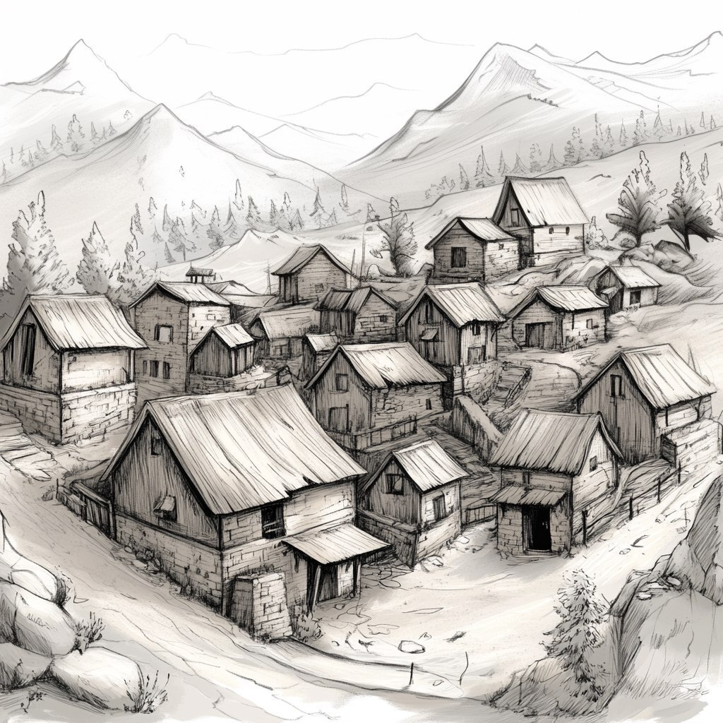 Создано на основе запроса: wooded foothills distant low mountains small poor medieval mining village scribble style sketch
