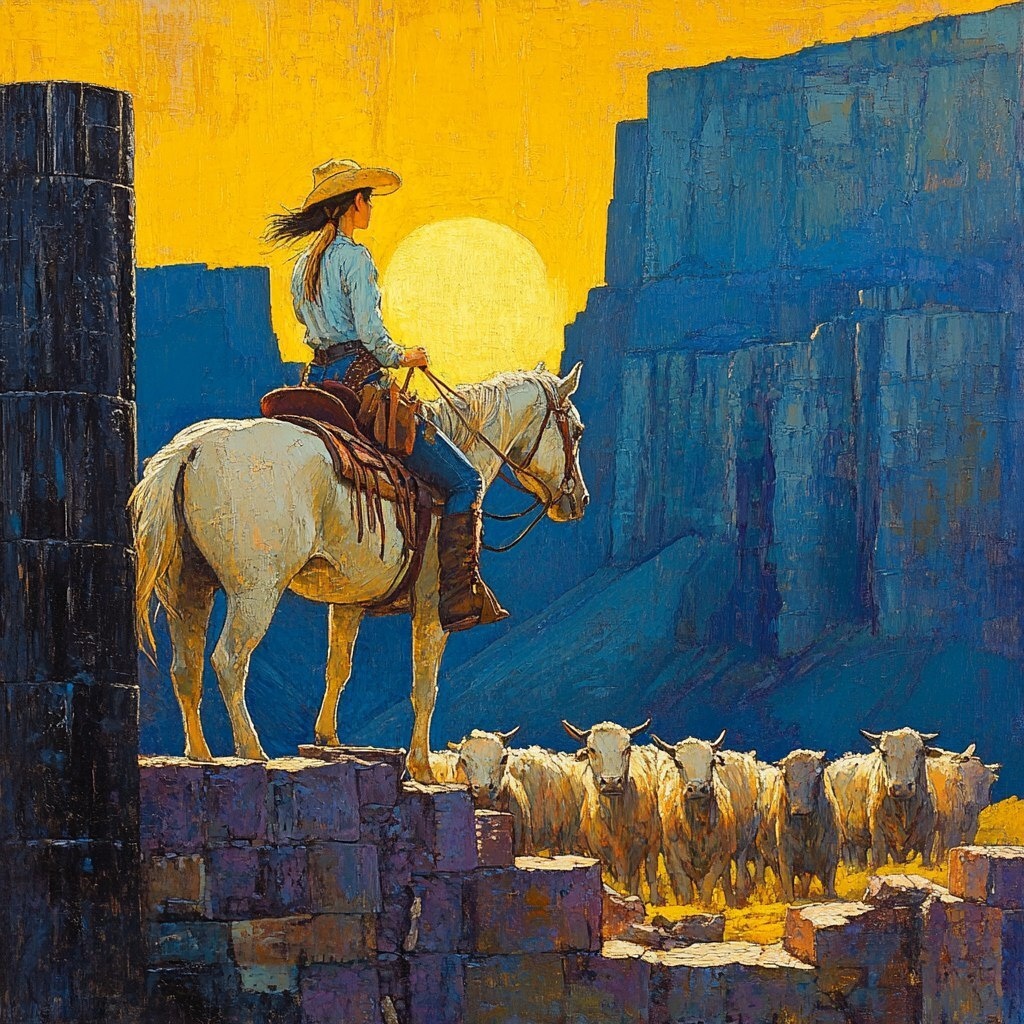 Создано на основе запроса: An adult healthy exceedingly attractive female cowboy on horseback, leading cattle along the edge of an ancient wall with black stone pillars standing tall and golden light filtering through. The scene is set against a backdrop of blue mountains under a yellow sun, creating a contrast between cool blues and warm yellows. --- Автоперевод: Взрослая здоровая, чрезвычайно привлекательная женщина -ковбой на лошадях, ведущая крупный рогатый скот вдоль края древней стены с черными каменными колоннами, стоящими высокими, а золотой световой профильтровывает. Круто получилось? 🤔 https://dzen.ru/id/65c0c65c86e4f837c27b24d7 #ИИ #AI #нейросеть #midjourney #art