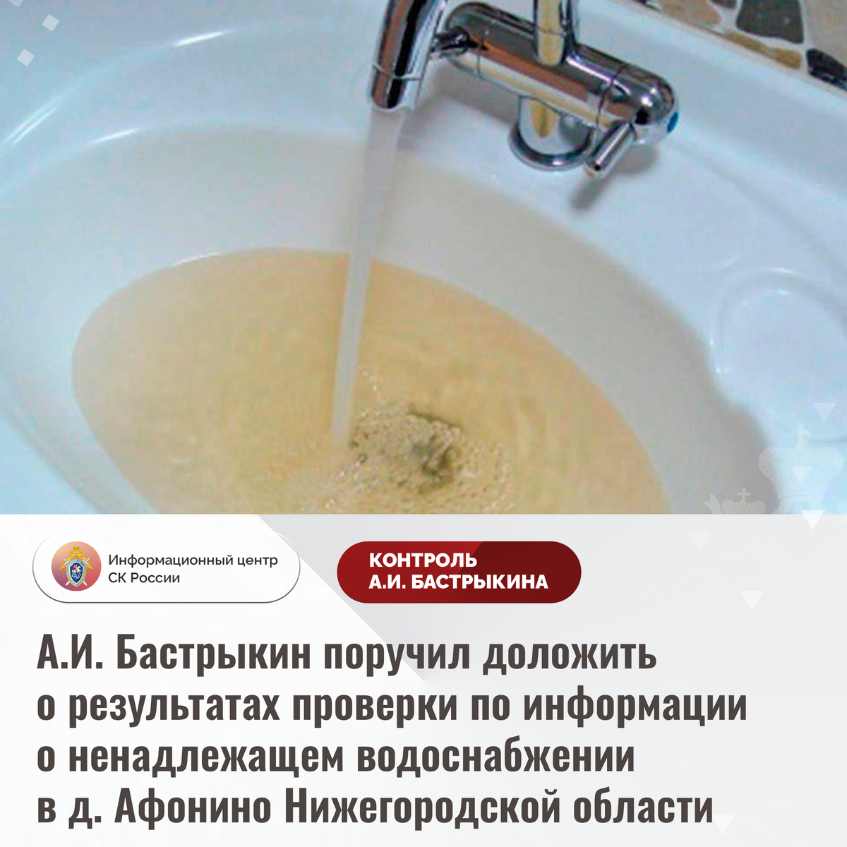 А.И. Бастрыкин поручил доложить о результатах проверки по информации о ненадлежащем водоснабжении в д. Афонино Нижегородской области В СМИ и социальной сети сообщается о нарушении прав жильцов многоквартирного дома по улице Красная Поляна в деревне Афонино Нижегородской области. В здание, 2017 года постройки, на протяжении трех лет подается вода желтого цвета с примесями, непригодная для питья и бытовых нужд. Многочисленные обращения граждан в профильные структуры результатов не принесли. В СУ СК России по Нижегородской области по данному факту организована процессуальная проверка. Председатель Следственного комитета Российской Федерации Александр Иванович Бастрыкин поручил руководителю СУ СК России по Нижегородской области Айрату Саетовичу Ахметшину доложить о ходе и результатах процессуальной проверки, поставив ее на контроль в центральном аппарате ведомства. #СледственныйКомитет #СКРоссии #СКР #ИЦСКР #ИнформационныйЦентр #АлександрБастрыкин #ПредседательСКР #КонтрольПредседателяСКР