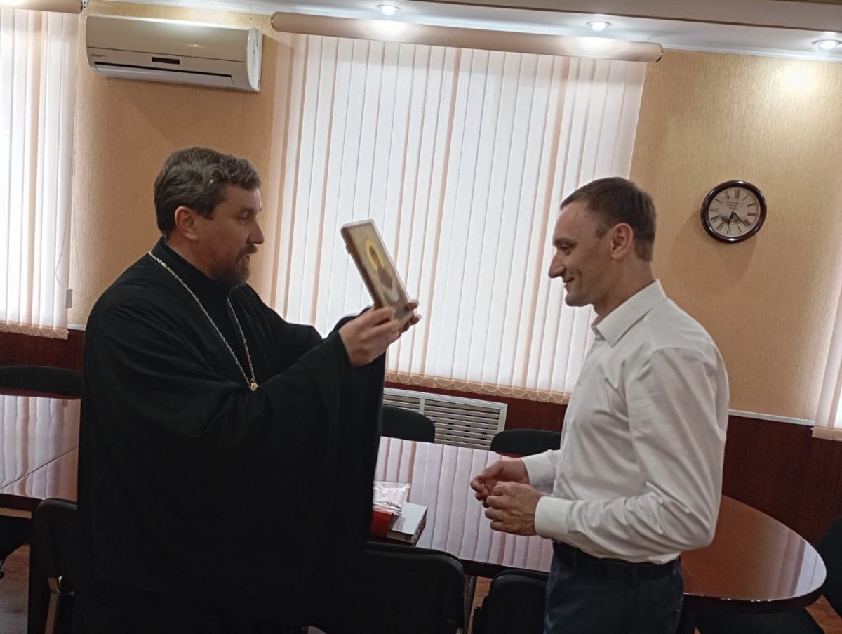 Встреча прошла в рабочем кабинете у Главы администрации муниципального образования «Акбулакский район». Отец Вадим благословил Сергея Владимировича иконой Покрова Пресвятой Богородицы, подарил книгу "Православные исторические храмы Оренбуржья" и сказал напутственные слова: