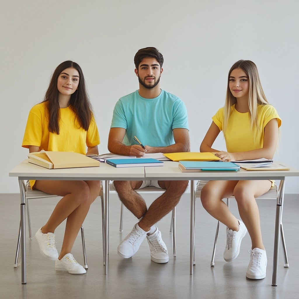 Создано на основе запроса: 3 students, 2 young woman and a young man armenian nationality sitting aound the dasc table . There are several flat books and copy books and a pans on the table. There is a minimalistic background classrom. Students are look happy, they are wearing yellow and turquoise and white T-shorts. Realistic photo --- Автоперевод: 3 студента, 2 молодая женщина и молодой мужчина Армянский национальность, сидящий в столе DASC. Отлично выглядит? 🤔 https://dzen.ru/id/65c0c65c86e4f837c27b24d7 #ИИ #AI #нейросеть #midjourney #art