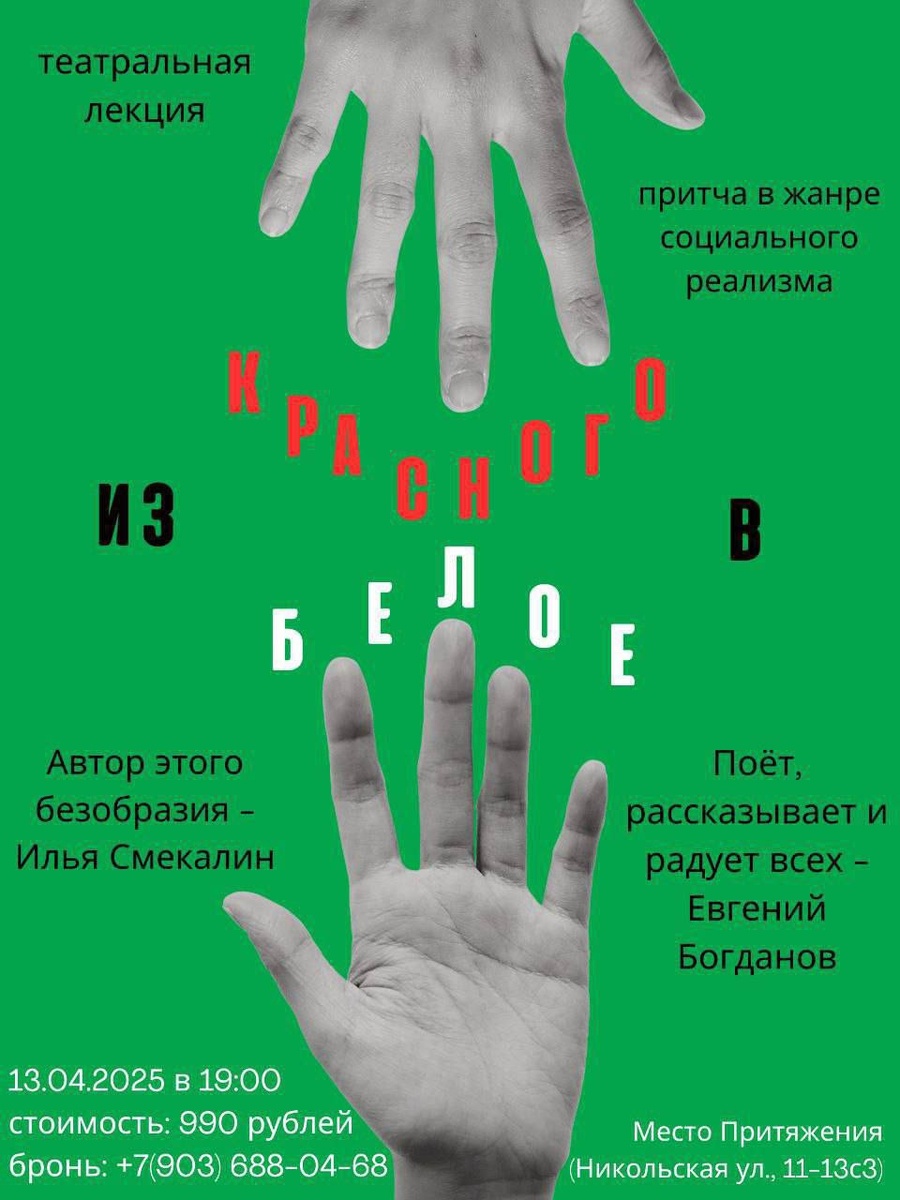 Завтра, 13 апреля, в "Месте Притяжения" на Никольской (да-да, рядом с Кремлём) состоится грандиозное мероприятие - лекция-перформанс "Из красного в белое". Ожившая история? Иммерсивное шоу? Балаган - как это назвал режиссёр? Приходите и узнайте сами! И я не только о формате мероприятия😉