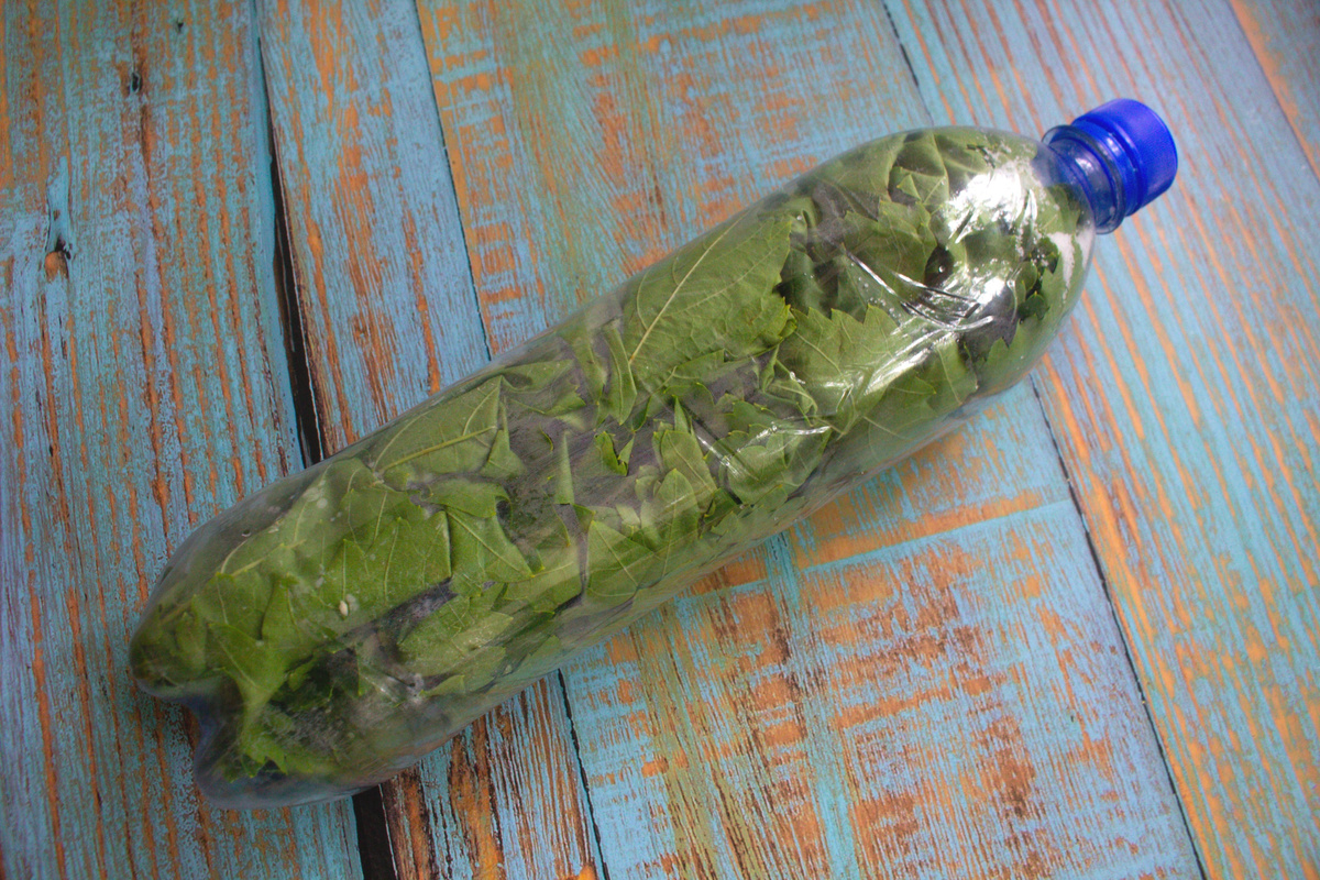 Долму у меня дома любят прям очень сильно. Весной, когда виноградные листья еще нежные, я заготавливаю их много и разными способами. В каждом способе есть свои плюсы и минусы. Расскажу, как без особых хлопот, маринования, закатывания банок и прочих сложностей сохранить виноградные листья. Хотя маринованные виноградные листья в банках, на мой взгляд, самые удачные. Покажу два способа. Промывать листья нельзя. Пока листья нежные, их достаточно протереть от пыли. Отбираем листья нужного вам размера. Далее, мы сворачиваем по два листа в трубочку и наполняем листьями пластиковую бутылку. Если листья в бутылке разворачиваются, ничего страшного, продолжаем наполнять. Далее, слегка утрамбуем листья чем-то длинным и не острым, чтобы они не порвались. Я утрамбовываю листья длинной ручкой половника для извлечения маринованных помидоров из банки. Эта ручка удобно загнута и не повреждает листья. Когда бутылка наполнена, высыпаем в нее крупную соль, примерно 3-4 ч.л. Бутылку закрываем крышкой, трясе