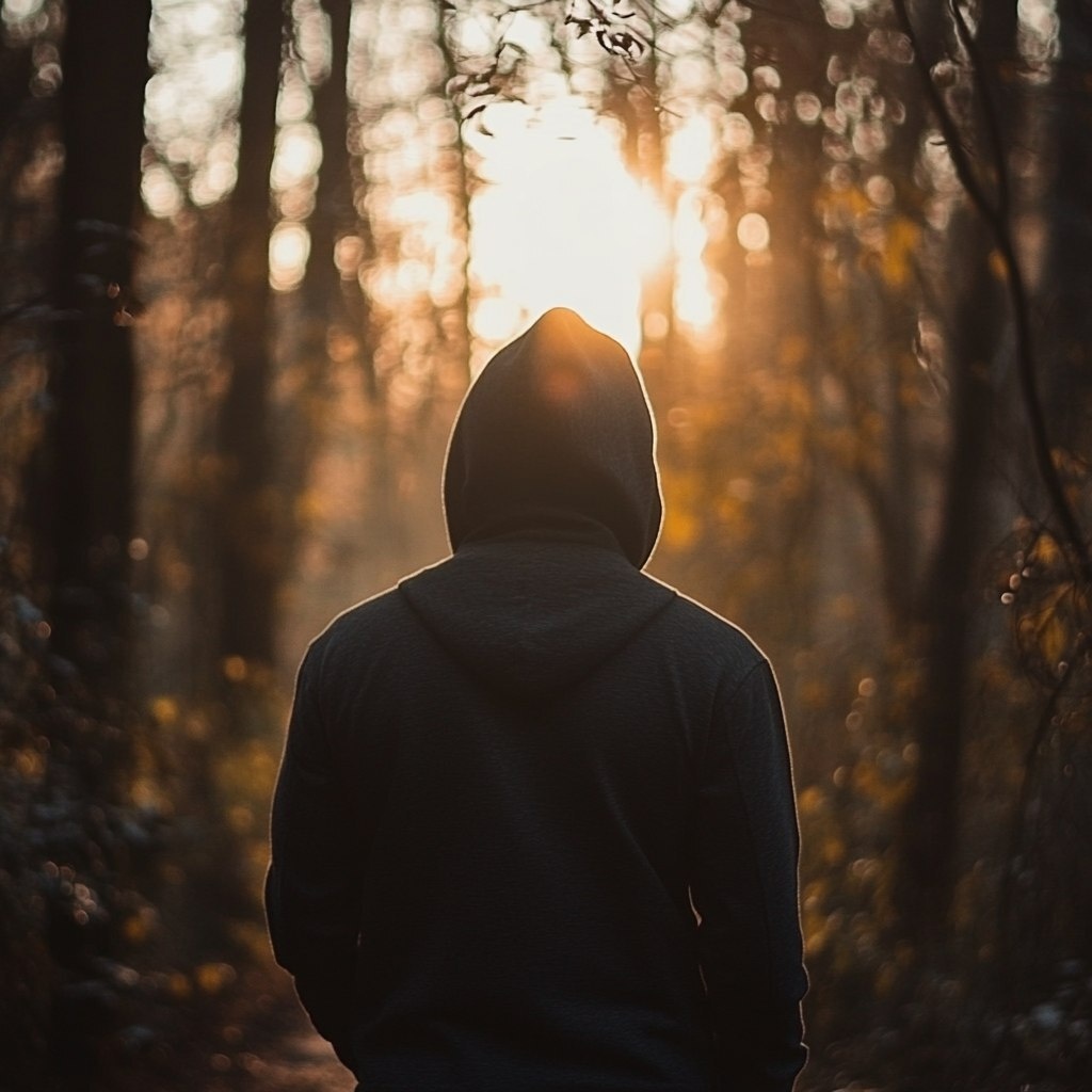 Создано на основе запроса: A photo-realistic image of a masculine figure seen from behind, standing on a quiet path in the woods at sunrise. The light filters through the trees, creating a warm and peaceful atmosphere. The figure is slightly turned, wearing a hoodie or jacket, suggesting calm reflection and new beginnings. No face, no text. Centered composition for a round profile frame.