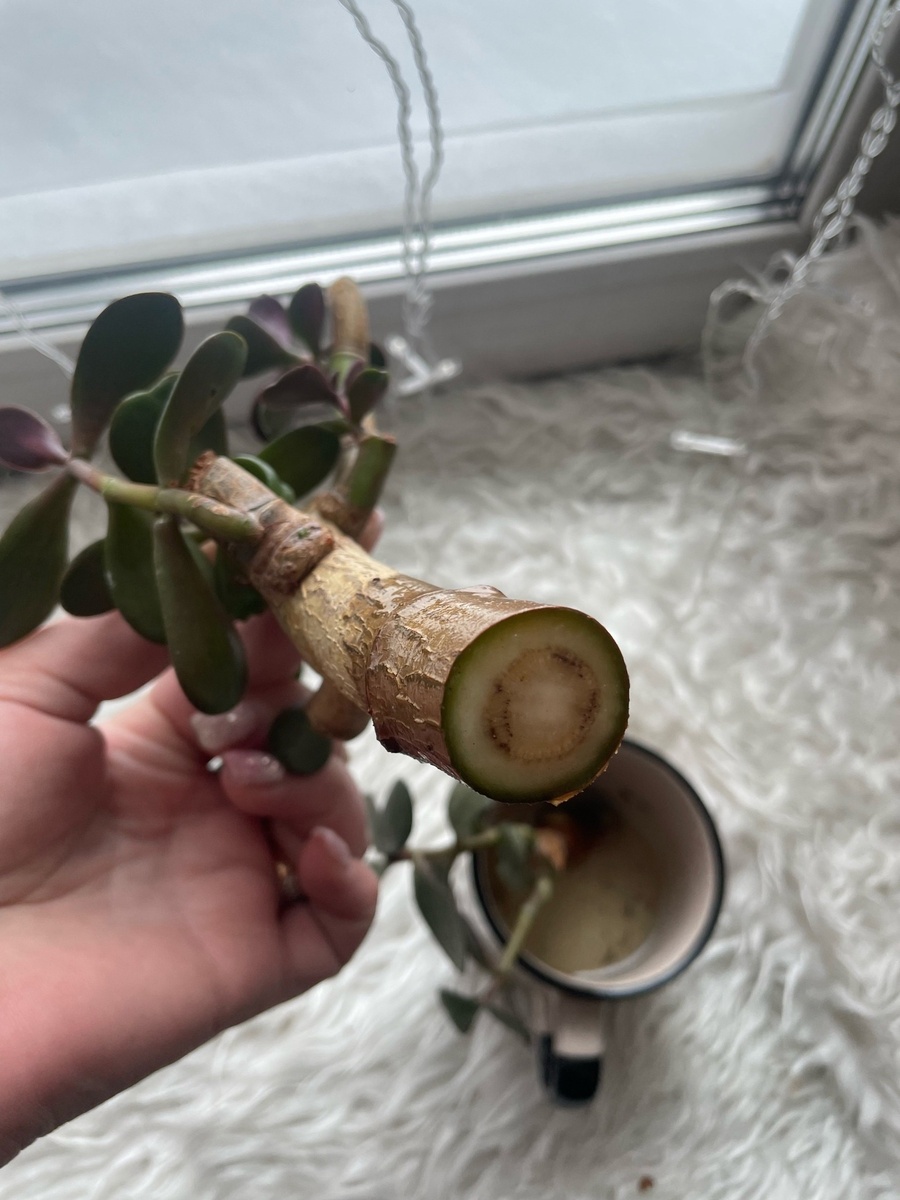 Здравствуйте, отдали денежное дерево. Было пять стволов, один сгнил напрочь. Два корни отвалились почти все но кое что удалось воткнуть. И вот осталось два вот таких резала я резала гниль и вот не пойму вот эти коричневые пятна это тоже оно и надо решать до чистого зеленого? Или это нормальное явление ствола. Они два заморыша у меня в стакане с водой, надеюсь на корни. Но думаю не надо ли резать еще?
