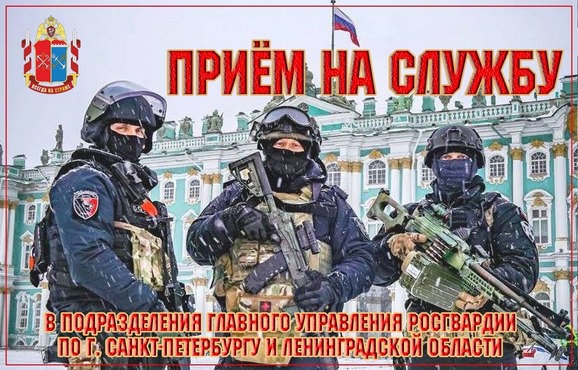 Главное управление Росгвардии по г.Санкт-Петербургу и Ленинградской области приглашает на службу граждан Российской Федерации от 18 лет, имеющих полное среднее образование, не судимых.