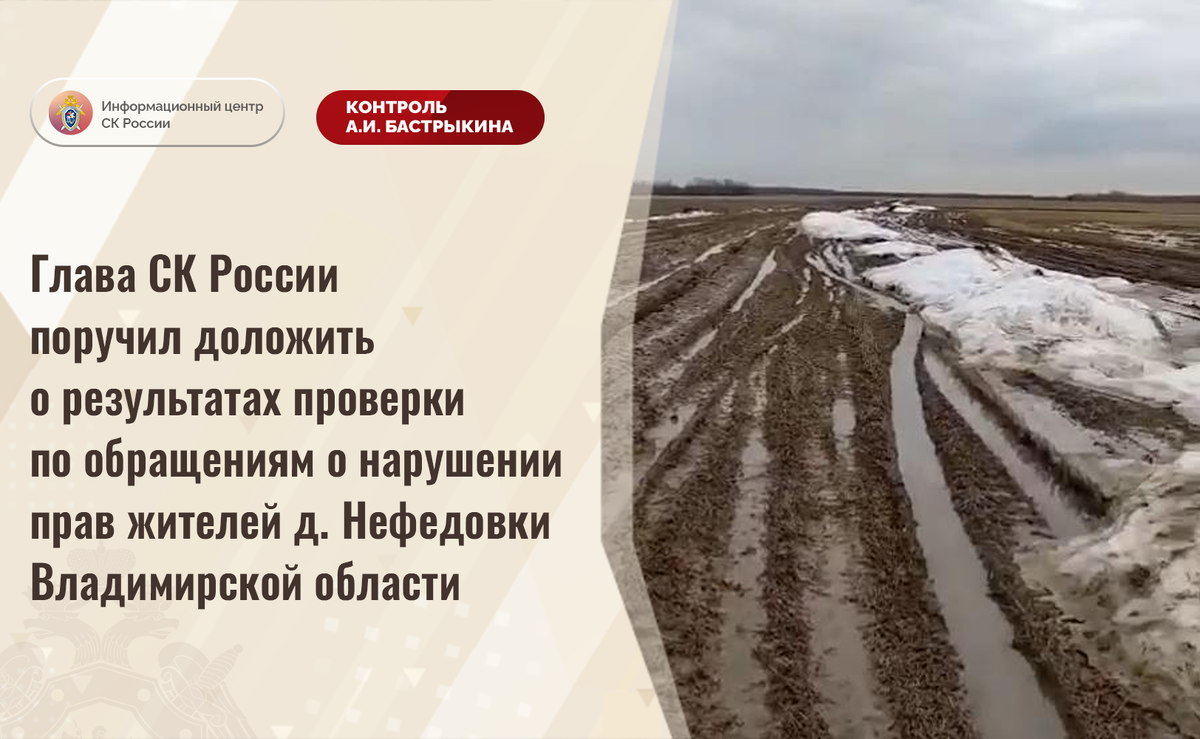 Глава СК России поручил доложить о результатах проверки по обращениям о нарушении прав жителей д. Нефедовки Владимирской области В комментариях в социальной сети размещены обращения в СК России по вопросу нарушения прав жителей деревни Нефедовки Владимирской области на транспортную доступность. Единственную грунтовую дорогу в населенном пункте в период осадков размывает, из-за чего проезд автомобилей и спецтранспорта, в том числе скорой медицинской помощи, затруднен. Более 20 лет граждане обращаются в местную администрацию с просьбой о строительстве асфальтированной дороги, однако, несмотря на наличие судебного решения, до настоящего времени меры к разрешению проблемы не принимаются. Ситуация освещается в социальных сетях. В СУ СК России по Владимирской области по доводам, изложенным в комментариях, начата процессуальная проверка. Председатель Следственного комитета Российской Федерации Александр Иванович Бастрыкин поручил руководителю СУ СК России по Владимирской области Артему Алекс