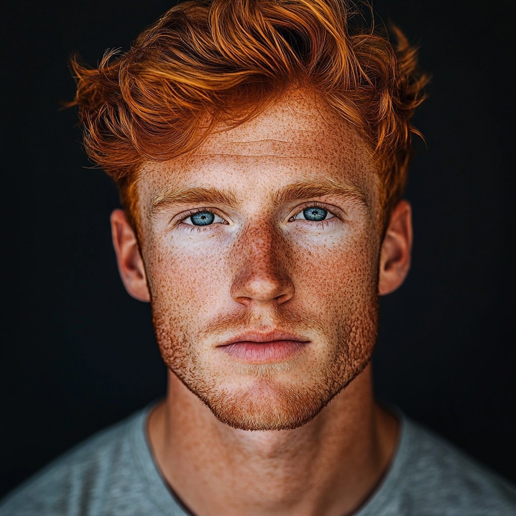 Создано на основе запроса: an hd photo of a man in His twenties who has ginger hair styled in a textured crop, bright blue eyes, and Nordic features.