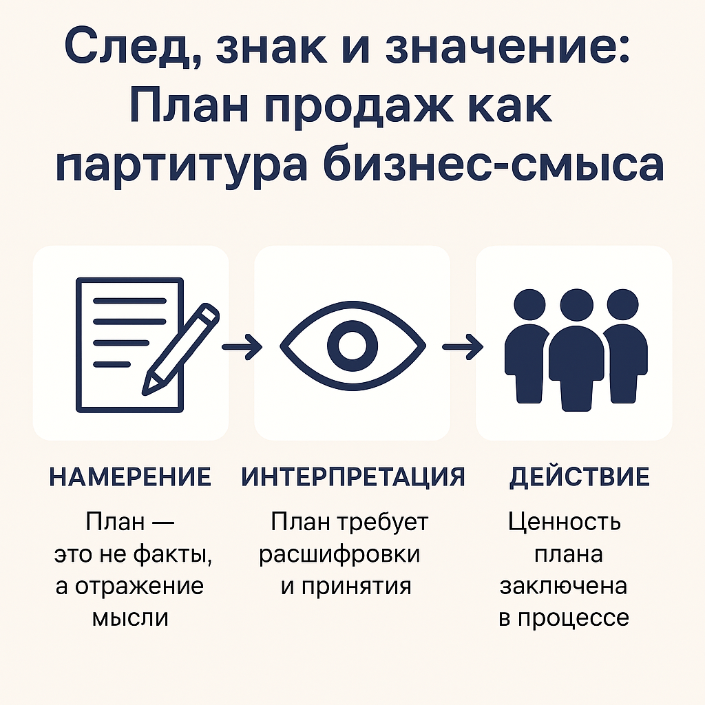 Он живёт только в контексте: в процессе создания, интерпретации и исполнения. Ценность его — не в попадании в цель, а в том, как вы к ней шли, с кем шли, и чему научились по дороге. Недавно в профессиональном чате владелец мебельного бизнеса задал, казалось бы, простой вопрос: «Есть ли наука, которая подскажет, как правильно создавать планы продаж?» Сначала я ответил привычно: что есть методологии, подходы, системный анализ, подбор под контекст… А потом понял: человек спрашивает не про метод. А про смысл. И вот тут начинается самое интересное. План — это не факты. Это инскрипция, след чьей-то мысли: это отпечаток намерения: кто писал, зачем, в каком состоянии. Иногда — это амбиция. Иногда — отчётность. А иногда — крик о помощи. Но чтобы этот след что-то значил, он должен быть прочитан.