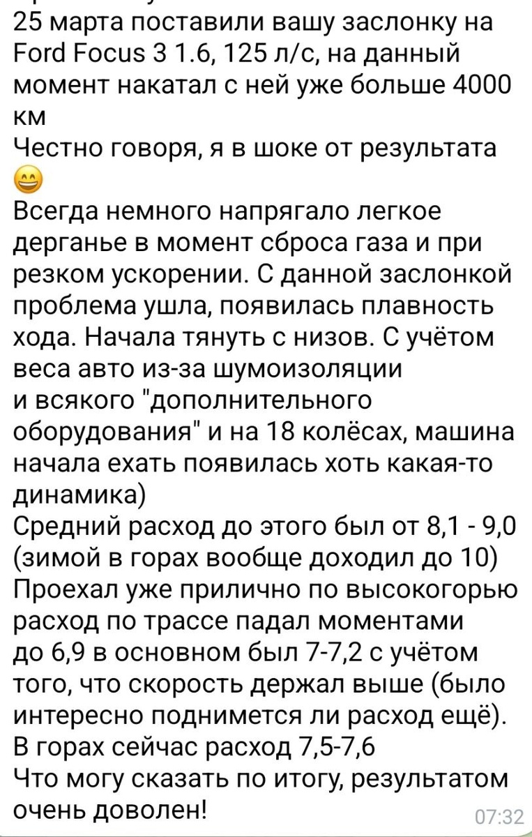 Форд фокус 3.1.6.125 л.с. Такой отзыв, мне прислал мой клиент на ниве тревел! Порекомендовал он своим близким мою доработку! Чтоб авто не стоял. Я на себя согласовав с владельцем заказл дроссель, переделал и отправил на них! На иномарки имеет смысл брать б.у. дррссель. На Ваз -это русская рулетка. Владелец нивы, также как и я получил +++ за позитив, от владельца форда! Благодарю!!!)))