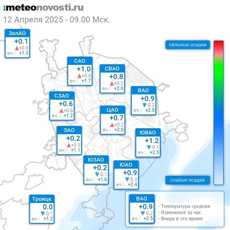 В 9:00 в Москве было от -0.5°C до +1.6°C, средняя температура +0.7°C #погода #Москва #весна #температура #12апреля #суббота