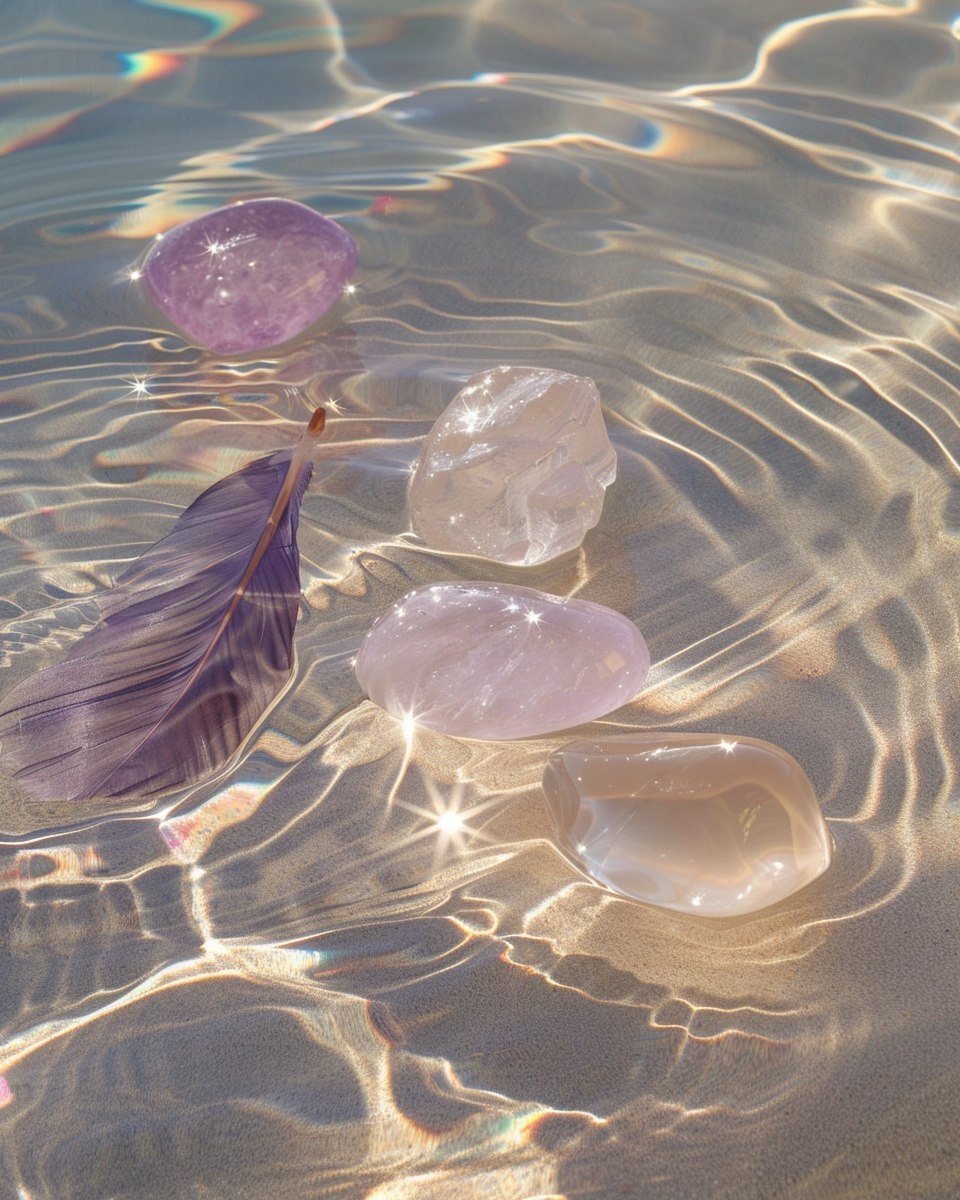 Создано на основе запроса: A photo-realistic image of still water, soft ripples with floating rose quartz, amethyst, and clear crystals. Subtle gold shimmer on the surface, a single feather floating nearby. High-vibe, calming spiritual scene. Created Using: Canon EOS R6, macro lens for water texture, golden hour reflection technique, minimalist spiritual styling, ripple distortion mapping, editorial realism processing, hd quality, natural look --- Автоперевод: Фотореалистичное изображение неподвижной воды, мягкие рябь с плавающей розовой кварцевом, аметистом и прозрачными кристаллами. Как тебе эта иллюстрация? 🤔 https://dzen.ru/id/65c0c65c86e4f837c27b24d7 #ИИ #AI #нейросеть #midjourney #art