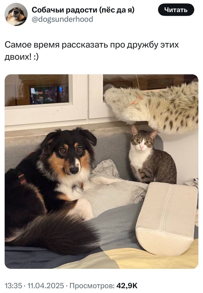 ⚠️В Твиттере появился трогательный тред, в котором девушка делится, как её собака адаптировалась к новому коту. Сначала между ними не было особой симпатии, и хвосты вызывали недовольство. Однако со временем они начали проявлять терпимость друг к другу, и собака даже начала заботиться о своем новом товарище. Их дружба крепла, и теперь они стали настоящими друзьями! Такие истории нам очень нужны! @chilhub