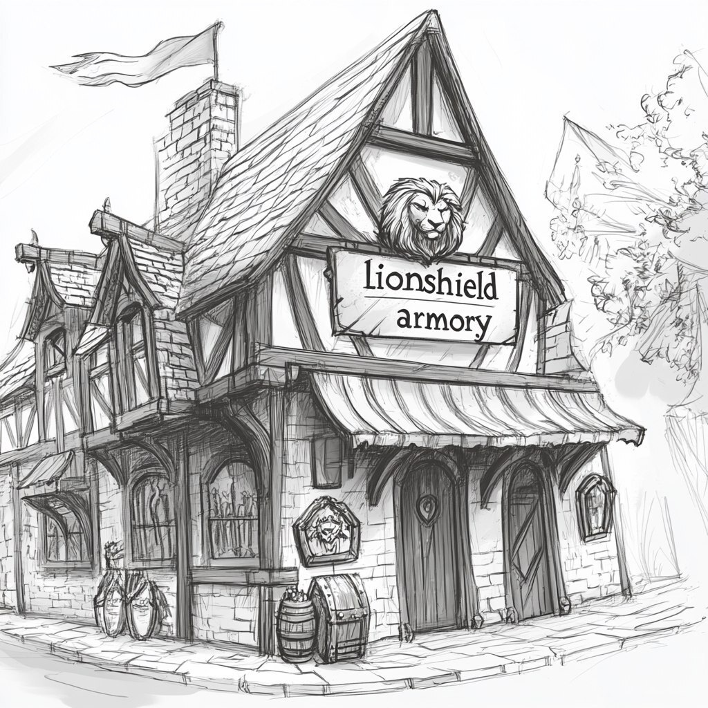 Создано на основе запроса: medieval shop with lion banner and sign saying "lionshield armory" scribble style sketch