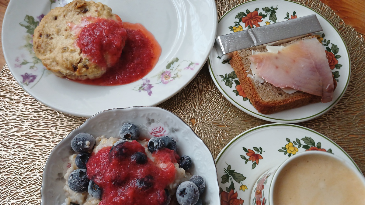 Сварила на завтрак ячневую кашу, испекла пп-запеканку из творога, были бутерброды с копченым муксуном и кофе с шоколадкой В кашу добавила голубику и клубничное пюре, я его замораживаю без сахара Пп-творожную запеканку замесила блендером, поставила выпекаться, а сама ушла гулять с собакой. Вернулась - и завтрак уже готов. Запеканка без сахара и без муки, очень нежная, рецепт напишу. А на обед и ужин ели харису. Снова не стала варить суп, решила, что лучше доесть то, что уже приготовлено. И еще кофе пили с конфетами, также еще было всем по маленькой творожной запеканочке Меню год назад