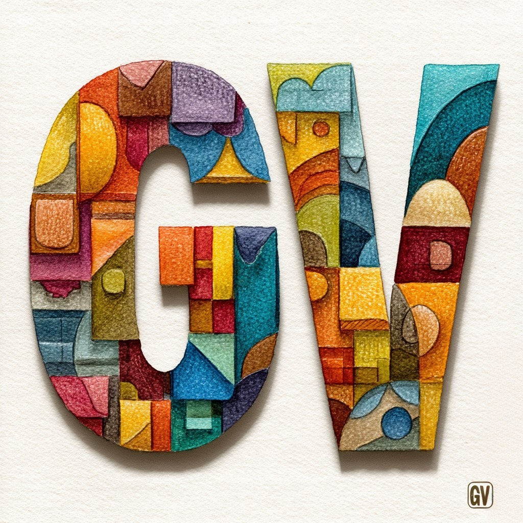 Создано на основе запроса: Congratulations card. Avant-garde letters in the style of cubism, from geometric figures, square, rhombus, oval, waves, different colors, artistic brush, palette, on a white background. Capital letters "G" "V"