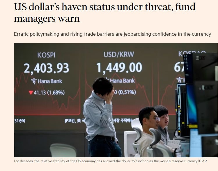 11-aprel kuni dollar yevroga nisbatan so‘nggi uch yil ichidagi eng past darajaga tushdi – Financial Times Nashrning mutaxassislarga tayanib xabar berishicha, global kapital uchun xavfsiz vosita hisoblangan AQSH dollari beqaror siyosat va savdo to‘siqlari sabab o‘z maqomini yo‘qotishi mumkin. @daryolive