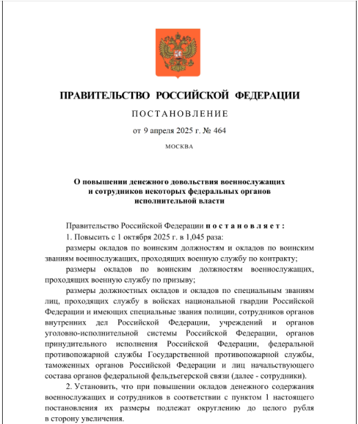 "О повышении денежного довольствия военнослужащих и сотрудников некоторых федеральных органов исполнительной власти" от 9 апреля сего года. Оно подразумевает увеличение денежного довольствия для военнослужащих как по призыву, так и по контракту, а также для определённых категорий гражданских служащих. Оклады будут повышены на 4,5%, что станет значимым событием для всех представленных категорий, а также для их семей. Вот выдержка из документа. Правительство Российской Федерации постановляет: 1. Повысить с 1 октября 2023 г. в 1, 105 раза: размеры окладов по воинским должностям и окладов по воинским званиям военнослужащих, проходящих военную службу по контракту; размер
