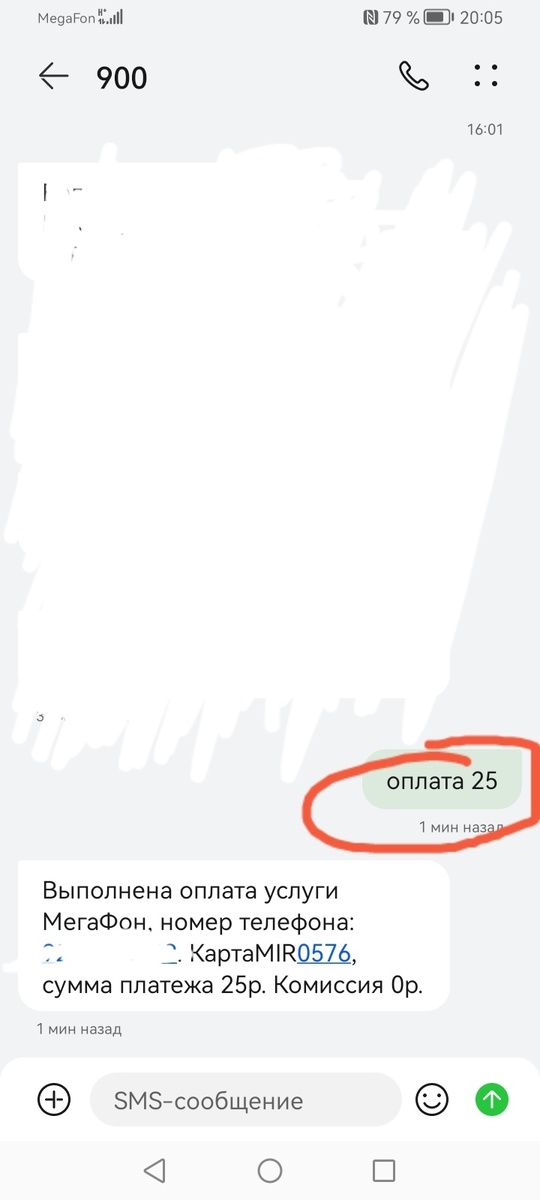 Недавно со мной произошла такая ситуация. У меня на счету было около -20 рублей (точно не помню, так как первого скриншота нет) 20:05. Я положил на счёт мобильного телефона 25 рублей, с запасом: Деньги пришли, и теперь на балансе явно должен быть плюс. Но вот мой баланс спустя минуту, в 20:06: Очевидно, что деньги уже пришли - и тут же списались 20:06. Снова перевожу на свой телефон, на этот раз 20 рублей: Баланс в 20:07: Это мне уже начинает надоедать. 20:08. Перевожу ещё 10 рублей. Уж сейчас-то точно должны закончиться списания (не могут же они продолжаться вечно) и баланс должен стать однозначно плюсовым: Но вот баланс в 20:42, не прошло и часа: Если Вы подумали, что у меня подключены какие-то платные услуги, то Вы не правы - их нет. И интернет у меня оплачивается раз в сутки. Причина была в другом. Когда я позвонил в поддержку "мегафона", мне сказали, что эти списания - плата за сообщения на номер 900. Но самая пикантность этой ситуации в том, что смс на номер 900 отправляются (!)