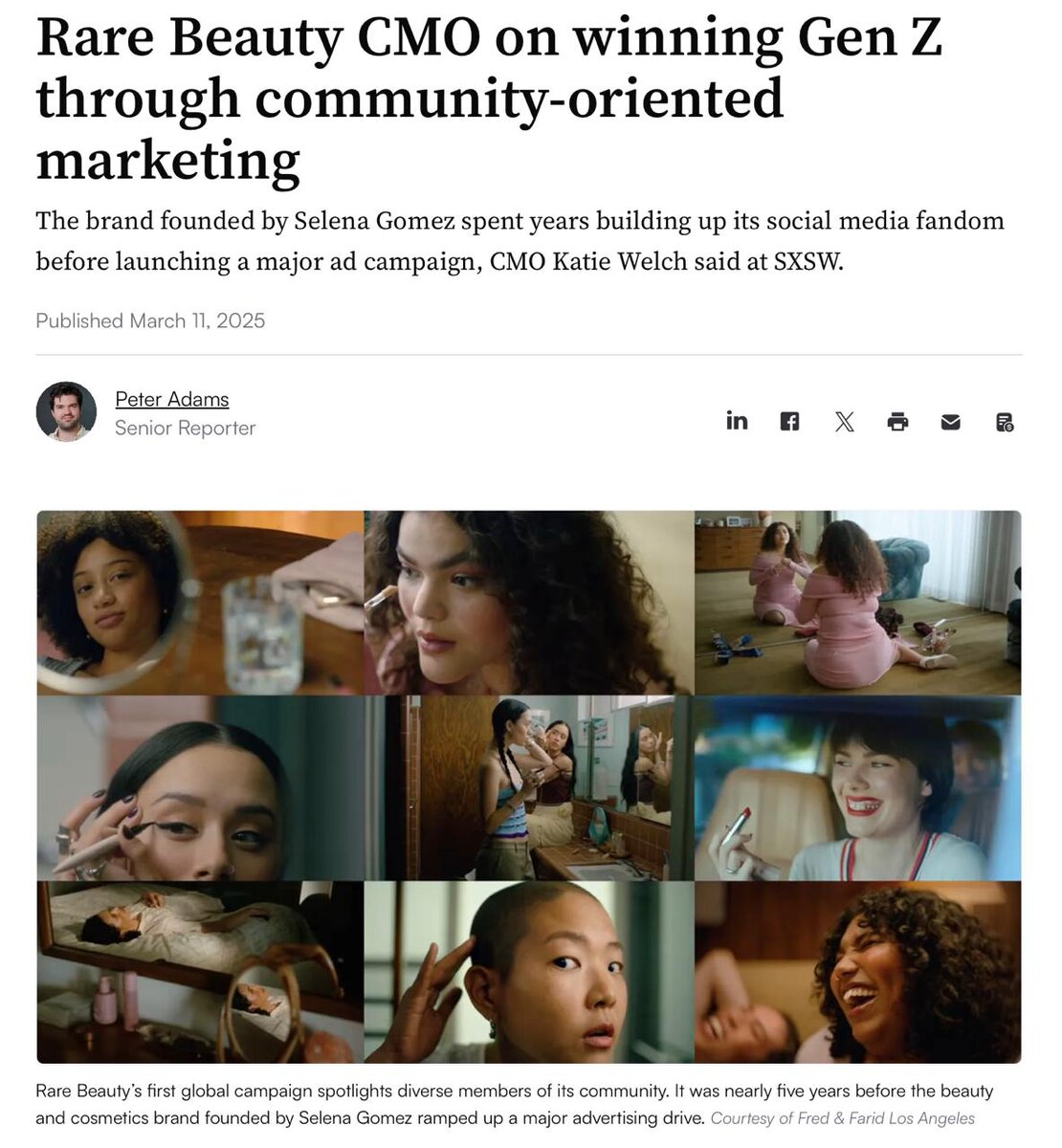 Что почитать на выходных — статью Marketing Dive о маркетинговой стратегии Rare Beauty для завоевания внимания зумеров