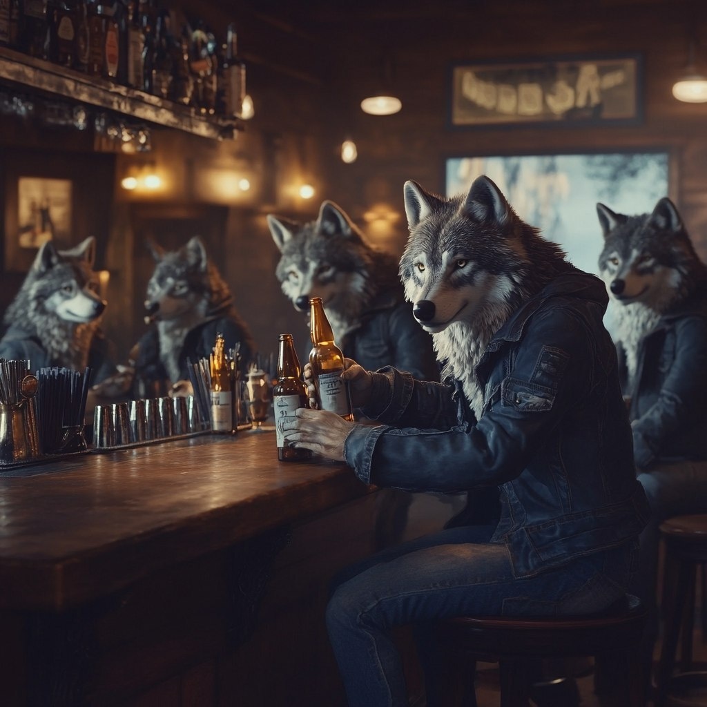 Создано на основе запроса: Make wolves sitting at the bar of a bar, holding beer bottles, the bar is full of wolves dressed in jeans and