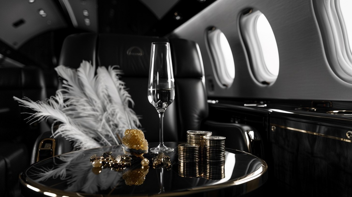 Создано на основе запроса: Black and white private jet interior, gold-trim table with citrine cluster, feather fan, and a small stack of