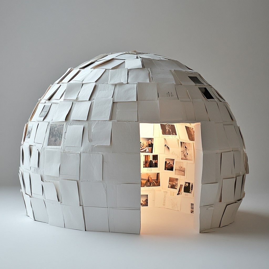 Создано на основе запроса: Create a Dome made of White Rectangular cartons. The architecture is looking like an Iglu. Outside White, Inside Full Immersion with Pictures. Every carton has a picture inside. --- Автоперевод: Создайте купол, изготовленный из белых прямоугольных коробок. Хорошо выглядит? 🤔 https://dzen.ru/id/65c0c65c86e4f837c27b24d7 #ИИ #AI #нейросеть #midjourney #art