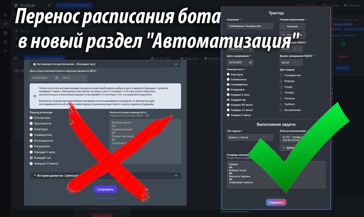 🌟 Перенос расписания бота в новый раздел "Автоматизация" ⚠️ ВНИМАНИЕ 13.04.2025 СТАРАЯ ВЕРСИЯ БУДЕТ ОТКЛЮЧЕНА! В этом видео я пошагово покажу, как перенести настройки автоматического расписания вашего бота из старого интерфейса в новый раздел "Автоматизация". Это важное обновление позволяет управлять всеми автоматизированными процессами в одном месте. 📺 YouTube: https://youtu.be/20JZaY2Mstg 📺 RuTube: https://rutube.ru/video/f04508ecc5c7390ddac3b445f1353cd3/ 📺 VK: https://vkvideo.ru/video-221439998_456239114 Пошаговая инструкция: ☑️ Находим старое расписание ☑️ Зайдите в настройки вашего бота ☑️ Прокрутите вниз до раздела "Активация по расписанию" ☑️ Скопируйте (или вырежьте) все команды из этого раздела ☑️ Отключаем старое расписание ☑️ Установите переключатель в положение "Отключено" ☑️ Сохраните изменения ☑️ Убедитесь, что появилась надпись "Активация по расписанию отключена" ☑️ Создаем новую автоматизацию ☑️ Перейдите в левом меню в раздел "Автоматизация" ☑️ Нажмите "+ Созд