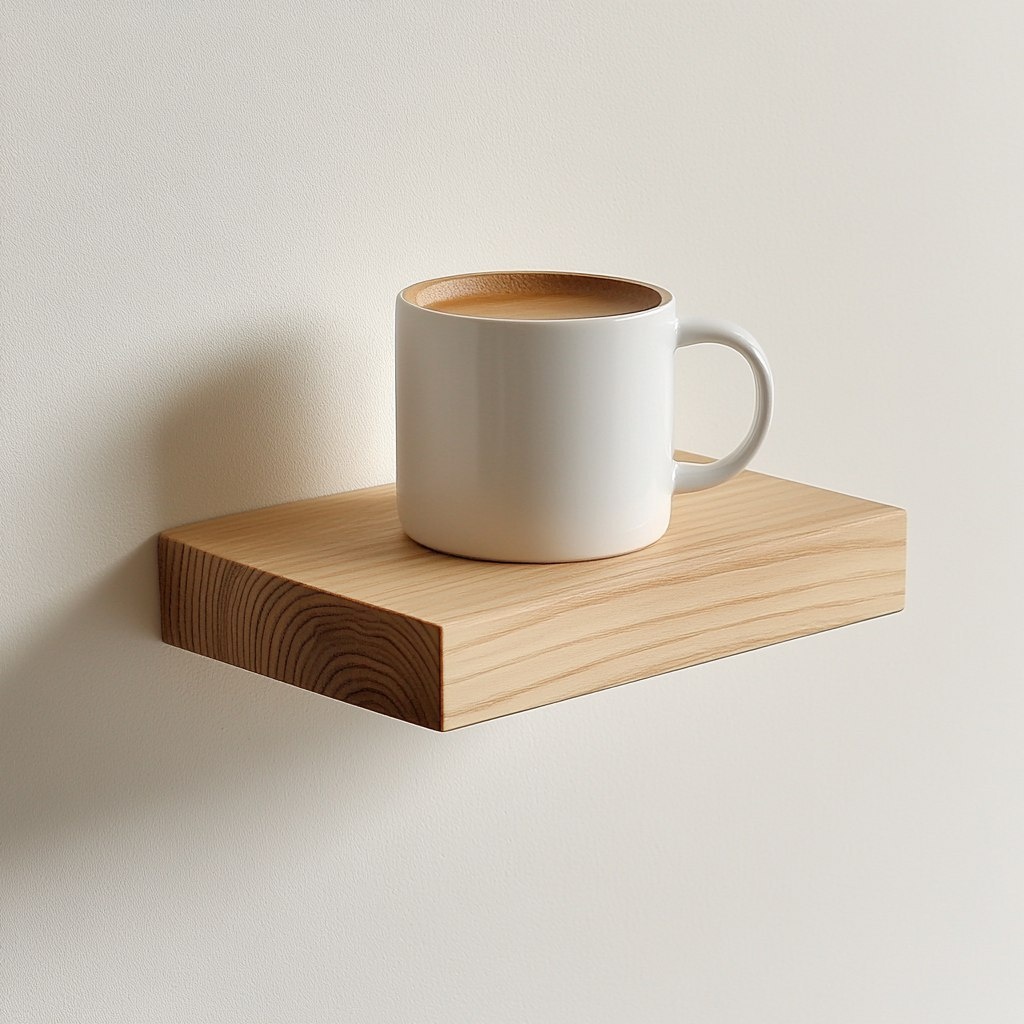 Создано на основе запроса: photorealistic minimalist floating wooden shelf cup holder, rectangular ash or oak wood block (6 inches x 4