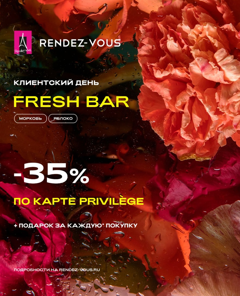 ⭐️ Клиентские дни Fresh Bar by Rendez-Vous 12 апреля мы рады пригласить вас на клиентские дни Rendez-Vous в формате Fresh Bar. • МЕГА в Уфе • Вегас Крокус Сити в Москве • Сити-парк Град в Воронеже • Адлер Сити Плаза в Сочи • МЕГА Белая Дача в Москве • Атриум в Москве • Щелковский в Москве • Казань Молл в Казани • Планета в Красноярске В эти дни в магазинах Rendez-Vous вас ждет скидка по карте Privilege -35% на товары без уценки (кроме брендов-исключений), а также возможность при покупке принять участие в розыгрыше, получить приятные подарки и свежевыжатые соки.
