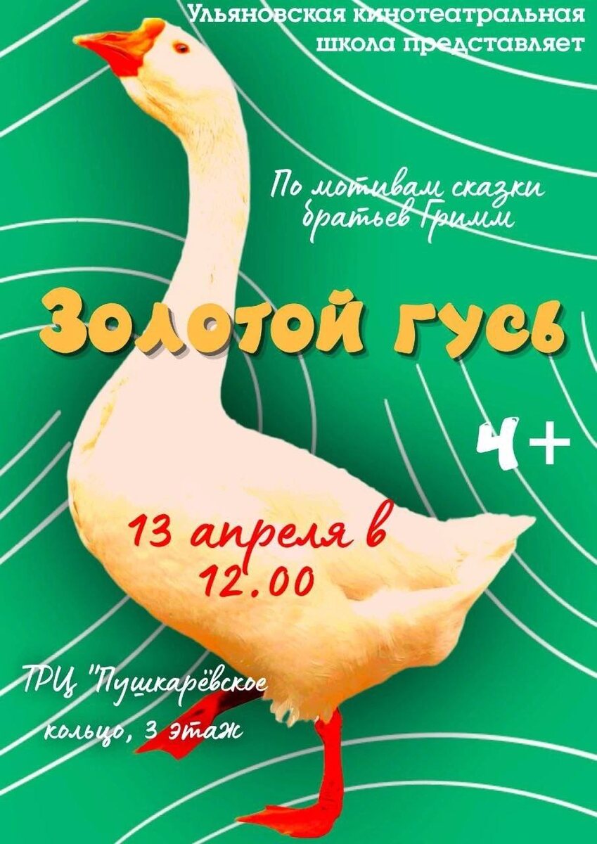 Спектакль по мотивам сказки братьев Гримм «Золотой гусь» от Ульяновской кинотеатральной школы 🗓 13 апреля 12:00 📍творческое пространство Пушкин, ТРЦ Пушкаревское кольцо, 3 этаж Эта история о том, как доброта и простодушие могут привести к успеху и счастью, несмотря на насмешки и пренебрежение окружающих. Сюжет сказки подчеркивает важность милосердия и отзывчивости, которые в итоге вознаграждаются. 🏷 вход свободный #13апреля25