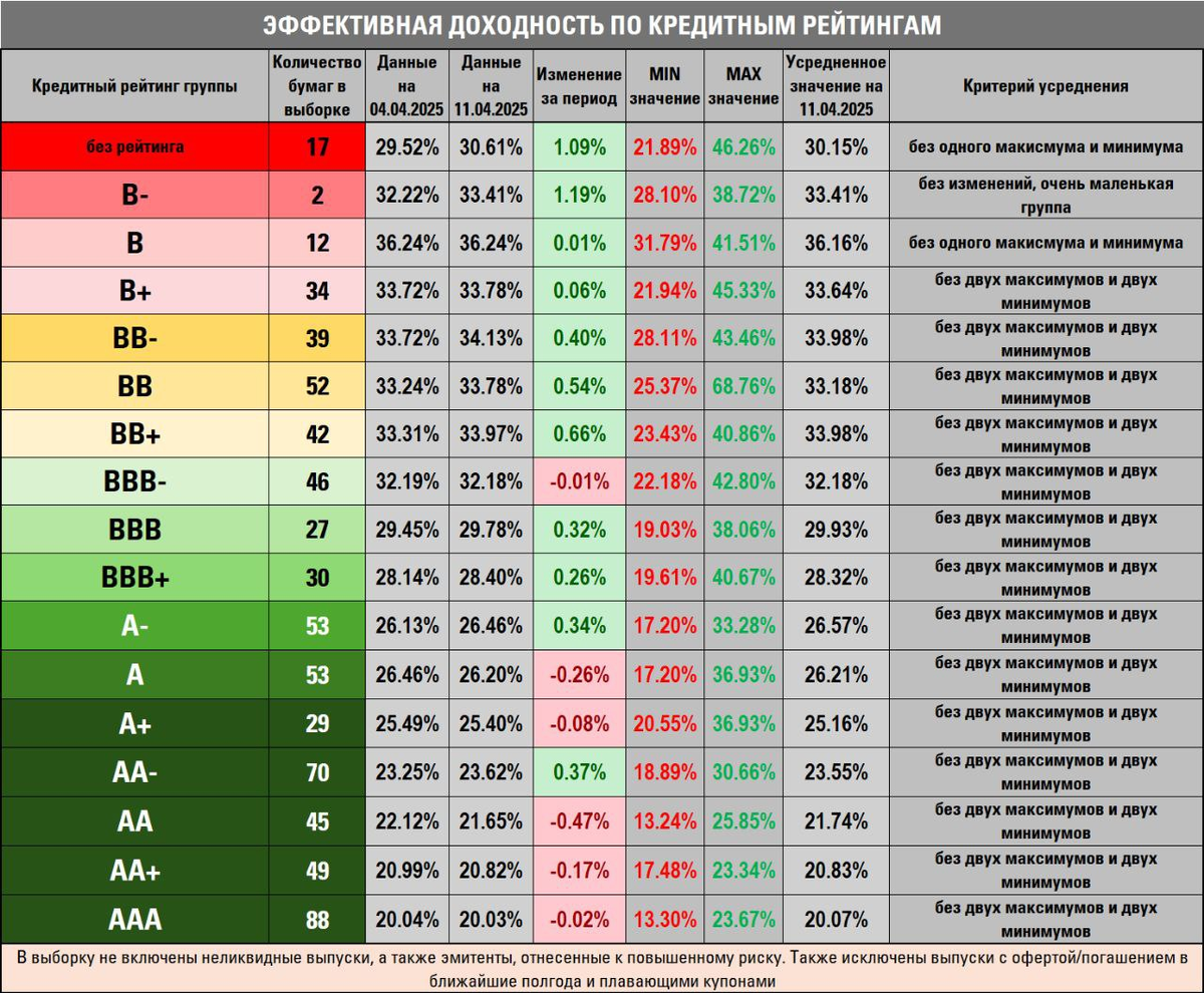 на 1️⃣1️⃣🍀0️⃣4️⃣🍀2️⃣0️⃣2️⃣5️⃣ 😇 Здравствуйте, дамы и господа. Единственный пост на этих выходных посвящен изменению доходностей по рейтингам. Сильно разглагольствовать не буду, ибо друзья сами с собой не погуляют :) К цифрам! 😊 Доходности в среднем подросли, на 0,25% за уходящую неделю. Но не все так однозначно - рост больше свойственен высокодоходным историям. Высокие рейтинги, напротив, стали чуть менее интересны. В любой нештатной ситуации рынок предпочитает уходить от риска, тенденция сейчас налицо. А то, как нас помотало за последнюю пятидневку, еще вспомним при случае. Тем не менее, купоны стабильно радовали, а значит все очень даже неплохо. ▶️ Список с лидерами рейтингов сегодня несколько экспериментальный - я убрал из него задвоения. В случае, если у выпуска/эмитента имеется два кредитных рейтинга, то судил его по всей строгости - по минимальному. Таким образом, подборка стала еще репрезентативнее, но пока не могу пообещать, что так будет всегда, если некоторые сложности р