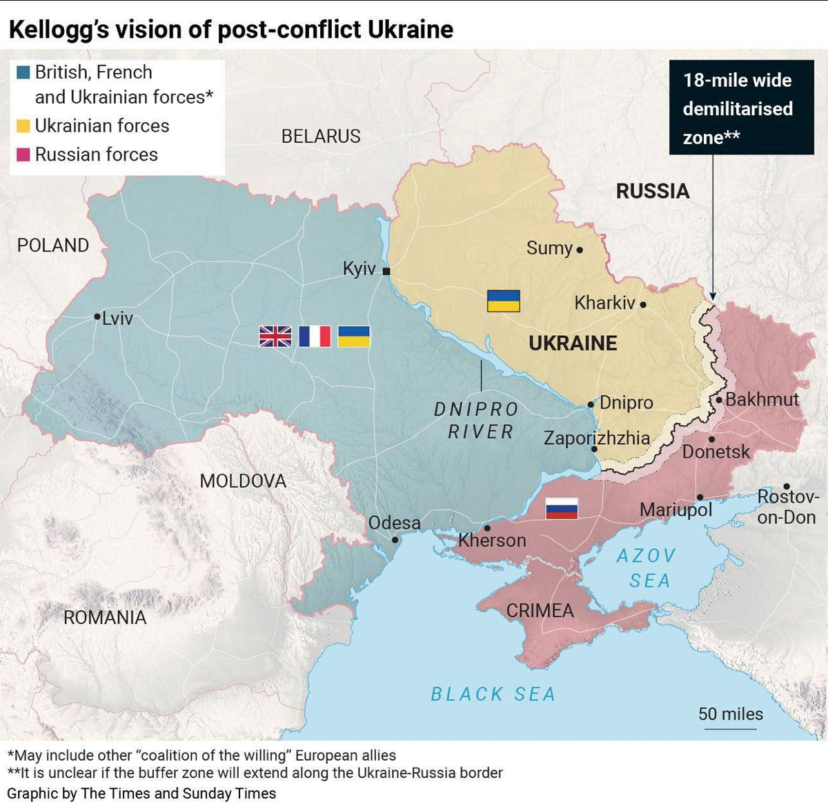 Разделить Украину, как послевоенный Берлин и Германию — такой план прекращения огня предложил спецпредставитель Трампа по Украине генерал Кит Келлог. Об этом сообщает The Times. Согласно предложению Келлога: Россия контролирует восток Украины, а британские и французские войска могли бы взять на себя зоны контроля на западе страны; Между армиями Украины и РФ предлагается создать буферную зону в км; США не будут направлять наземные войска; Новые выборы на Украине могут пройти после заключения перемирия; Это первое предложение от высокопоставленного американского чиновника, в котором допускается, что Днепр может стать своего рода линией разграничения после прекращения огня, отмечает The Times. …по сути, это возврат к перемирию 1666 года, осталось Киев взять в наём и выбрать двух гетманов - Правобережного и Левобережного. Ничего этого не будет. Но сам вброс любопытен. Трамп претендует на половину Украины через Европу. Типа: мне не надо, пусть европейцы контролируют. Но надо ему, конечно.