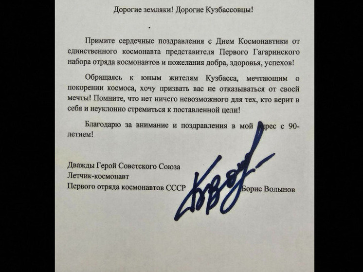 Поздравление было опубликовано в социальных сетях губернатора области Ильи Середюка. Волынов, единственный ныне живущий космонавт из первого отряда, дважды становился Героем СССР. В своем обращении он призвал кузбассовцев не отказываться от мечты о покорении космоса и отметил, что «нет ничего невозможного для тех, кто верит в себя и стремится к цели». Стоит напомнить, что в декабре космонавт отметил свой 90-летний юбилей.