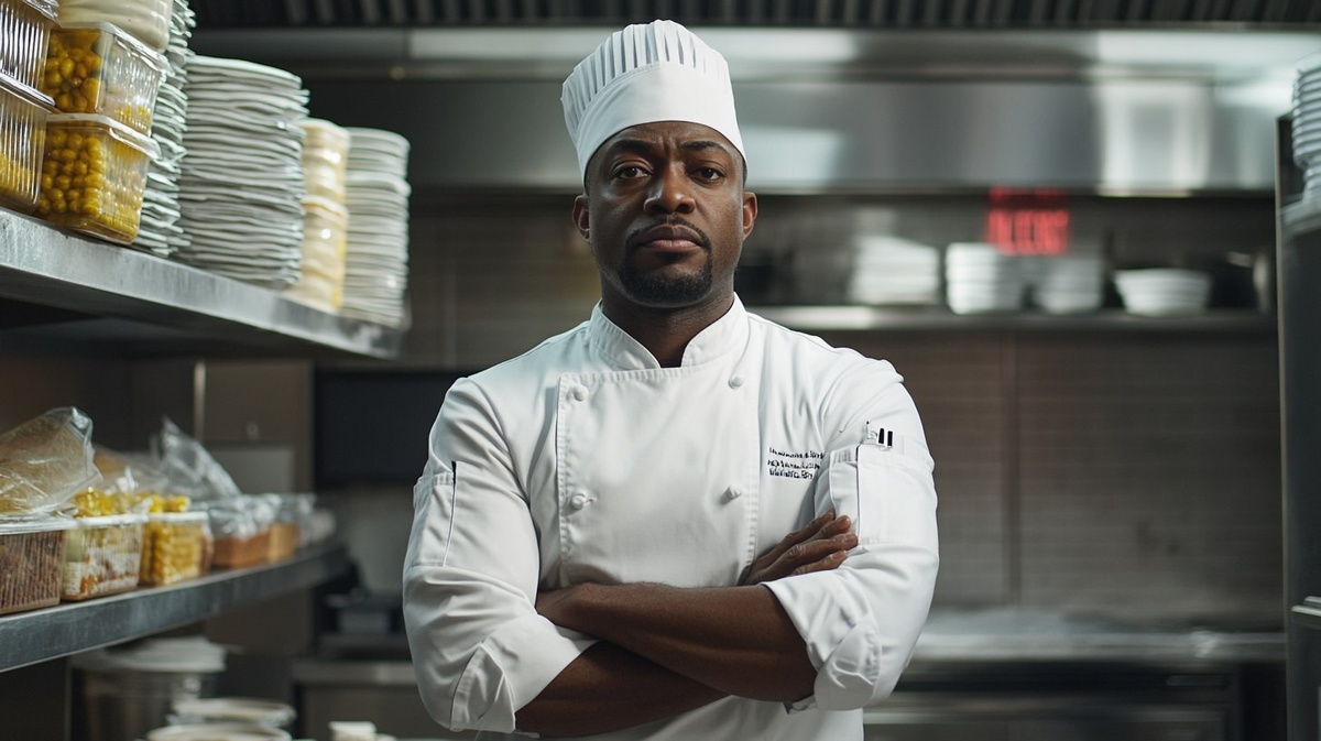 Создано на основе запроса: The Chef, a Black man in his late 30s to early 40s dressed in a clean white chef’s jacket and apron, with a