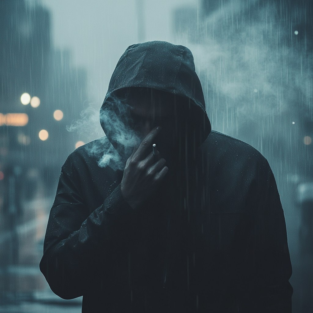 Создано на основе запроса: a man standing alone under light rain, hood on, hand near his face, smoking gesture, no face visible, cinematic