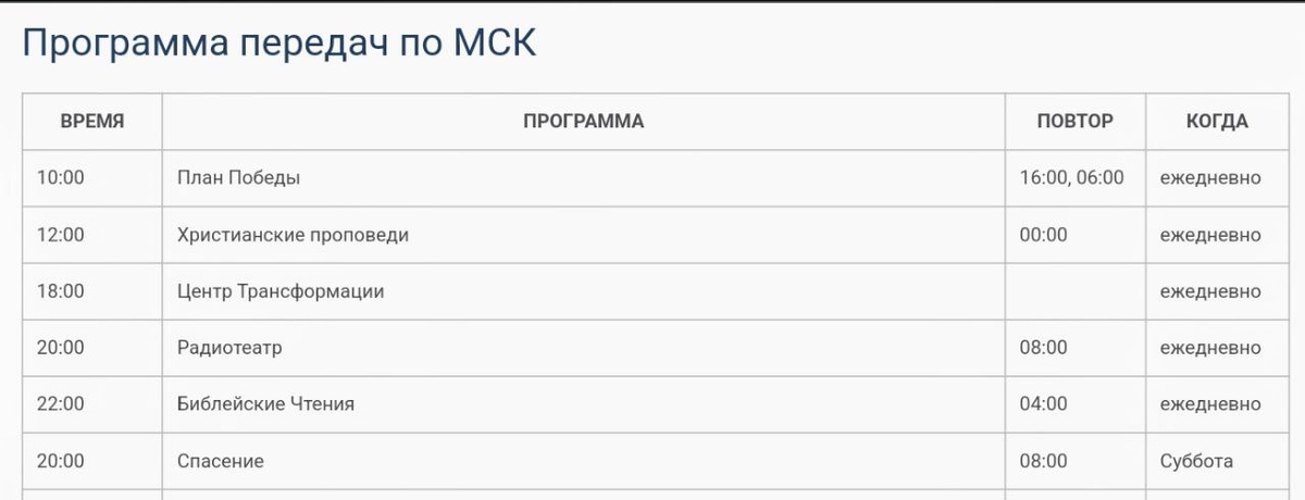 Программа передач (сетка вещания) по московскому времени. Ежедневное расписание эфира. Актуальная до 1 июня 2025 г. Приятного прослушивания и Божьих благословений... Подробности на сайте: http://golosistini.ru/pages/programmaperedach.html
