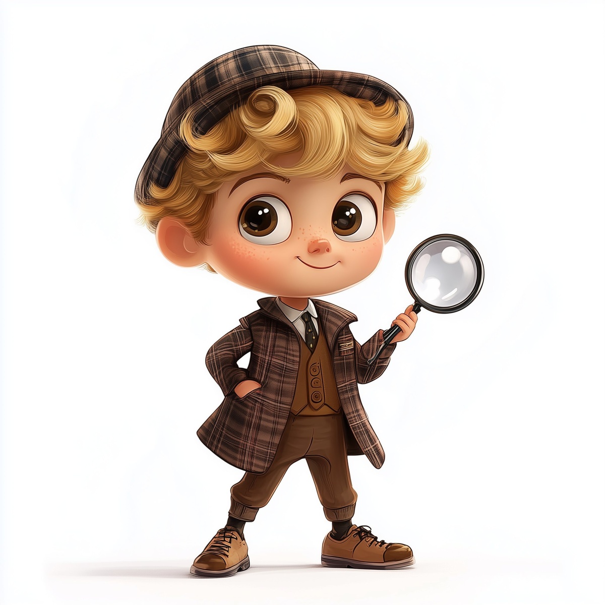 Создано на основе запроса: blonde little boy in a cartoon style mid length hair with some curls dressed as a classic private investigator