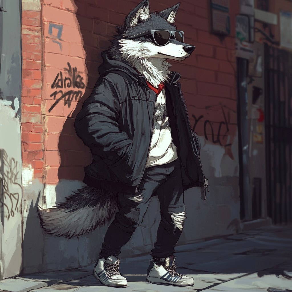 Автоперевод: Сделайте волк с городской одеждой, солнцезащитными очками, прогулками по улице в городе, Имаджен в стиле крошечных