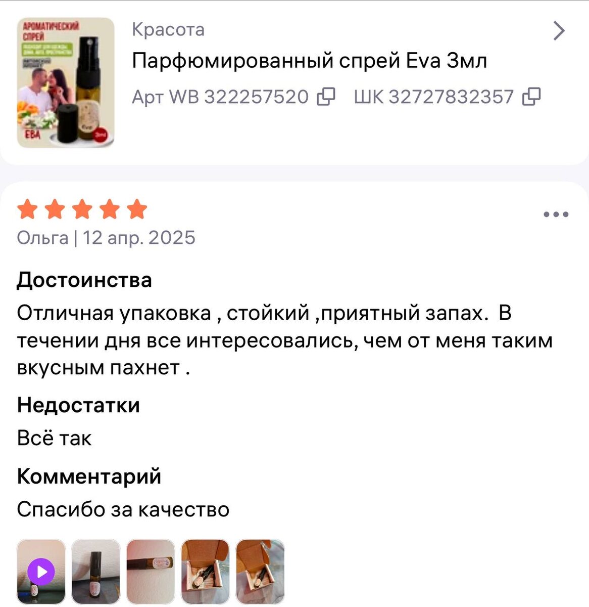 Сегодня такой хороший отзыв получила на духи «ЕВА» с видео 🫂 Благодарю ☺️носите с удовольствием 🤗 Духи «ЕВА» 15 мл спрей на ВБ арт: - 240105798 3 мл спрей артикул: - 322257520