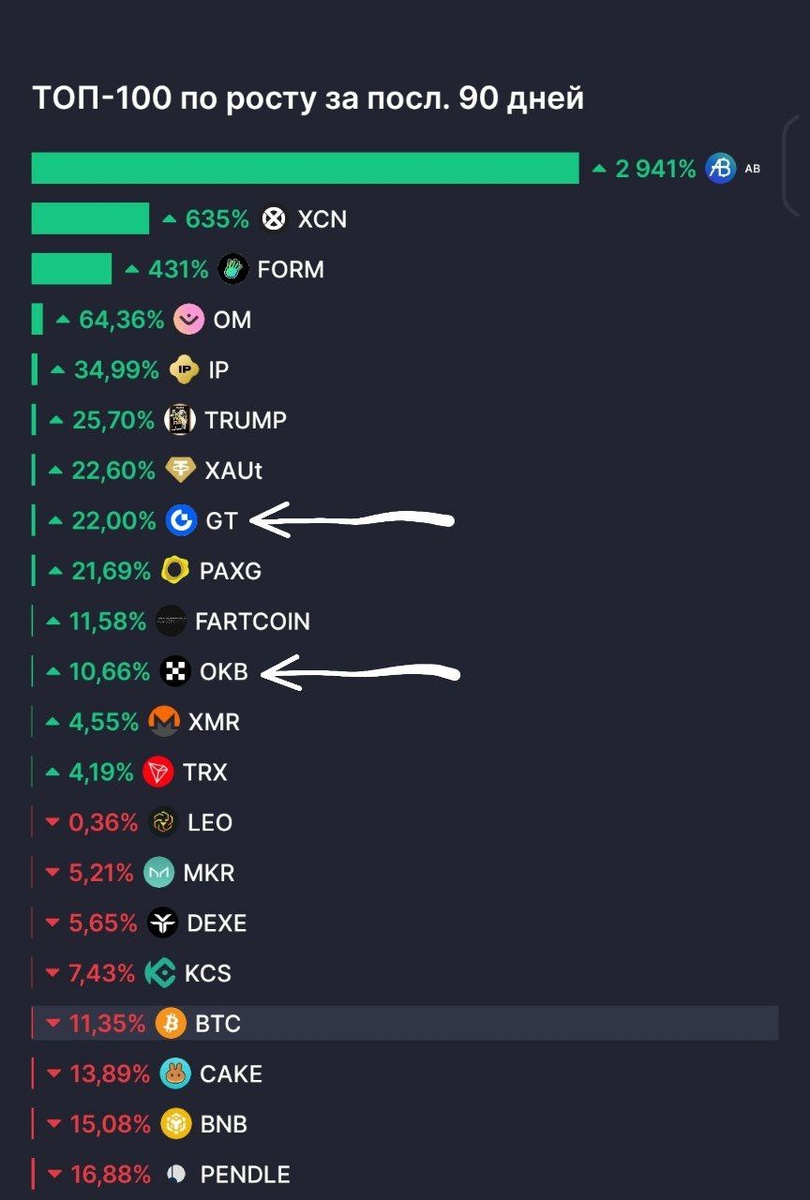 Если посмотреть топ 100 монет по росту за 90 дней, то можно отметить на падающем рынке монеты двух бирж, которые сохраняют рост.