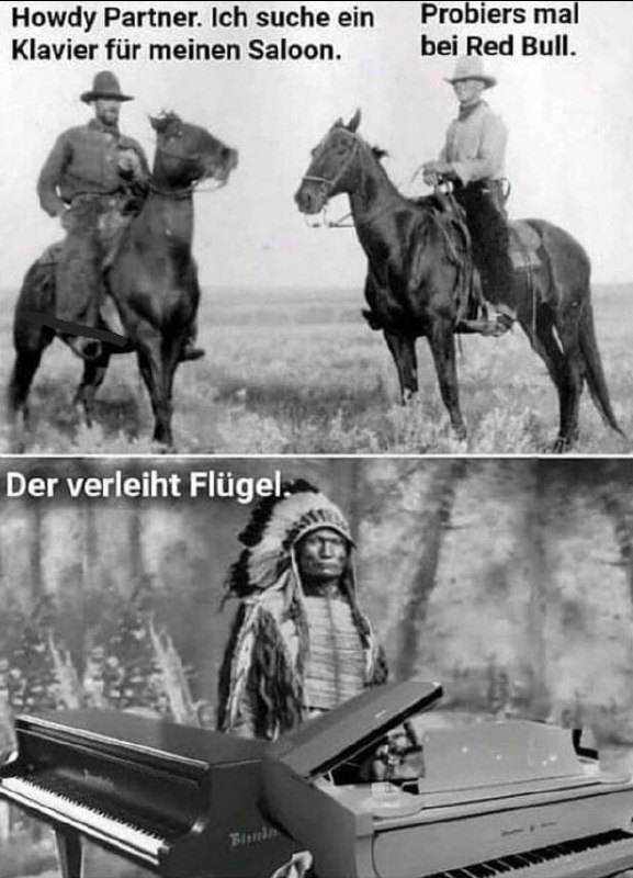 Verleiht Flüüügel 🕊 Когда придумывали немецкий язык, его сконструировали с целью придумывать интересную игру слов. Разберём Wortspiel из этого мема! ◀️ В основе – стереотип, что в каждом салуне Дикого Запада обязательно должно быть пианино (Klavier), ну и пианист, в которого не стреляйте ◀️ Лозунг Ред Булла по-немецки звучит так: "Red Bull verleiht Flüüügel" (Ред Булл окрыляет, дословно: даёт крылья) ◀️ Flügel – это не только крылья, но и рояль (в противоположность искомому клавиру) ◀️ Red Bull – звучит не только как название энергетика, но и как стереотипное имя индейца. Большой Змей, Быстроногий Олень, Красный Бык, ну вы понимаете 🐂 💡 А есть среди вас смельчаки, готовые перевести мем на русский язык, сохранив игру слов? 😏 🔡 Учиться с нами
